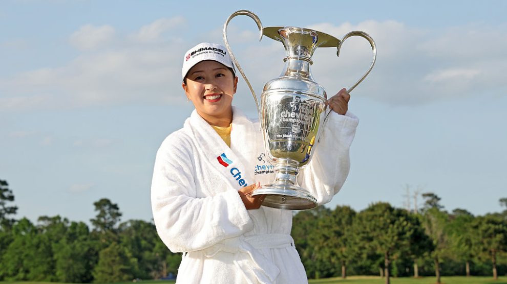 THE WOODLANDS, TEXAS - APRIL 27: Mao Saigo of Japan poses with the trophy after winning The Chevron Championship 2025 in a playoff at The Club at Carlton Woods on April 27, 2025 in The Woodlands, Texas. (Photo by Sarah Stier/Getty Images)