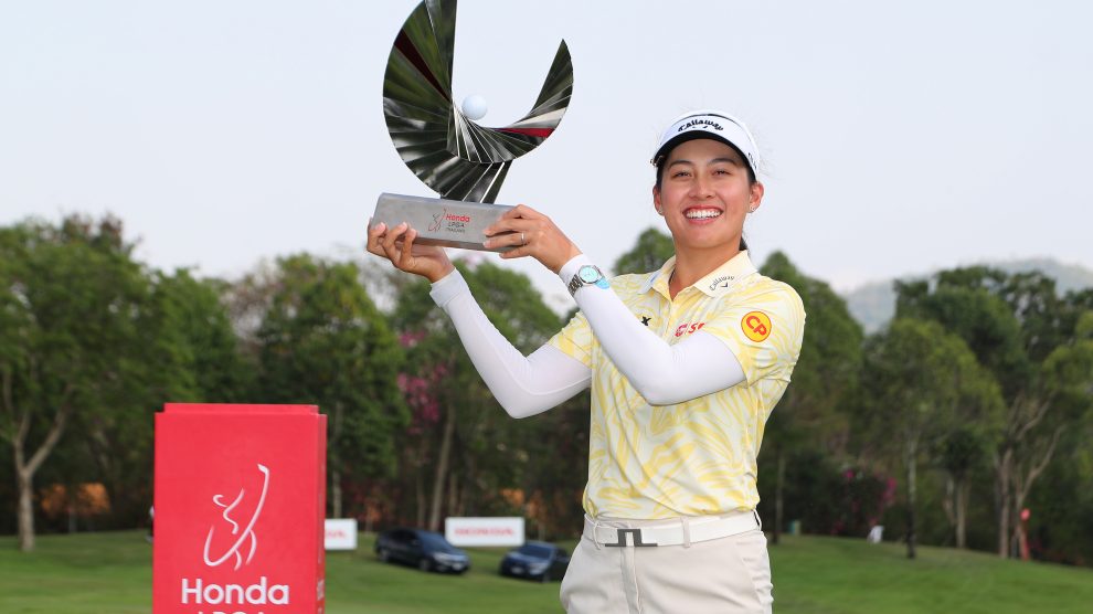 CHON BURI, THAILAND - FEBRUARY 22: Jeeno Thitikul of Thailand poses with the trophy after winning the tournament following the final round of the Honda LPGA Thailand 2026 at Siam Country Club on February 22, 2026 in Chon Buri, Thailand. (Photo by Thananuwat Srirasant/Getty Images)