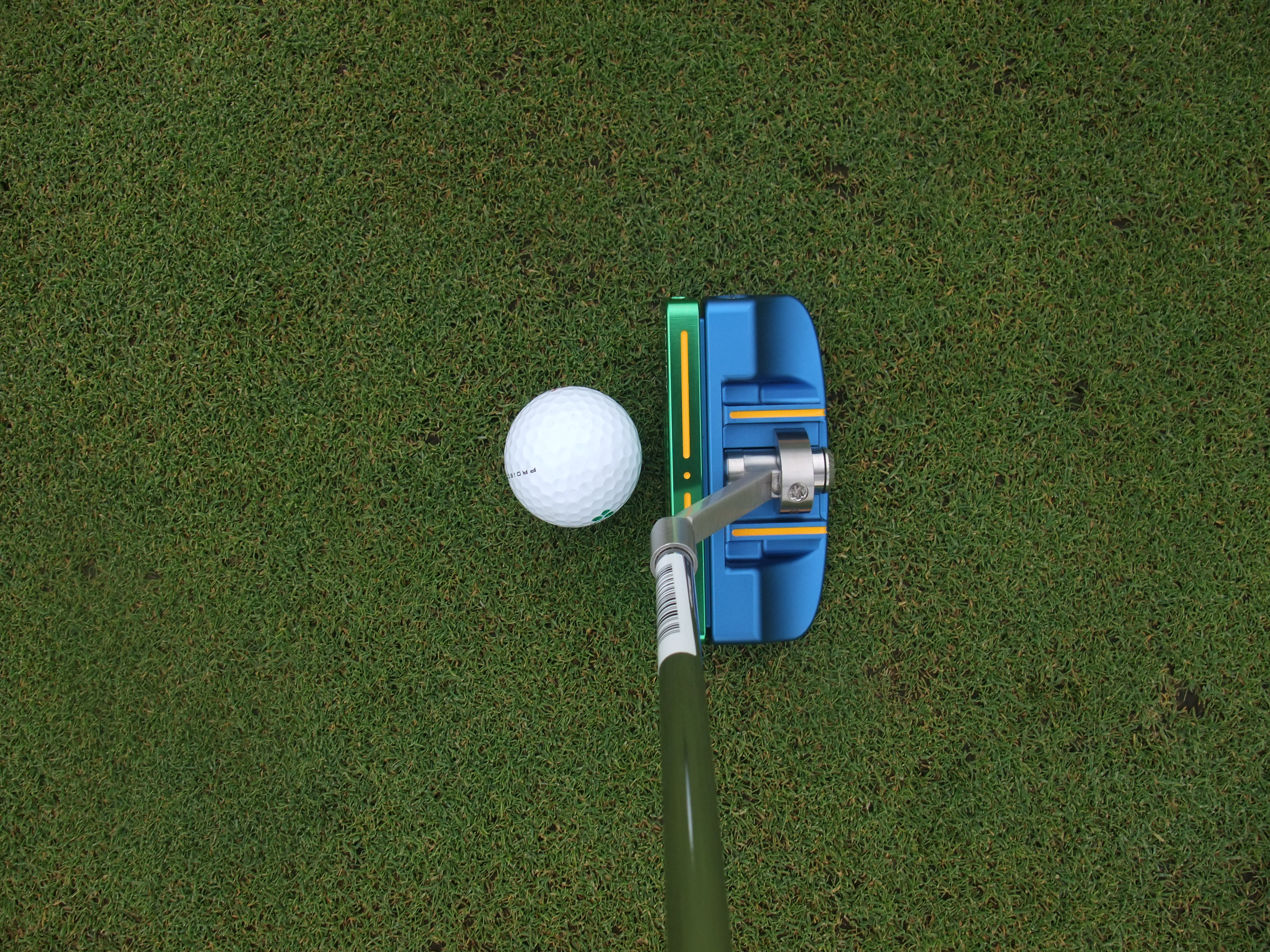 Aesthetically, the Happy putter is very appealing. The CNC-machined aluminum face is a lighter green, while the aluminum blue head is a nice contrast. It's not distracting at all, even if you're used to a traditional metal look. It definitely stands out, but in a good way. It's a lot of fun to take off the head cover and start practicing with it. There are just so many possibilities that, even if you're locked into a series of settings, it's hard not to feel excited to use it -- like you're in on a secret.